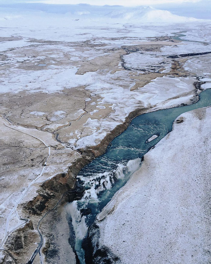 Gullfoss is one of the sights of Iceland. It is a magnificent waterfall on the Hvitá, where the white water of the river cascades over a series of step-like barriers stretching from side to side, and then plunges finally over a ledge of very hard rock into a yawning abyss more than a hundred feet deep, whence it throws up clouds of spray that are carried hither and thither as the wind sweeps first this way and then that; so thick is the spray, that one's clothing soon becomes saturated on incautiously getting into it.