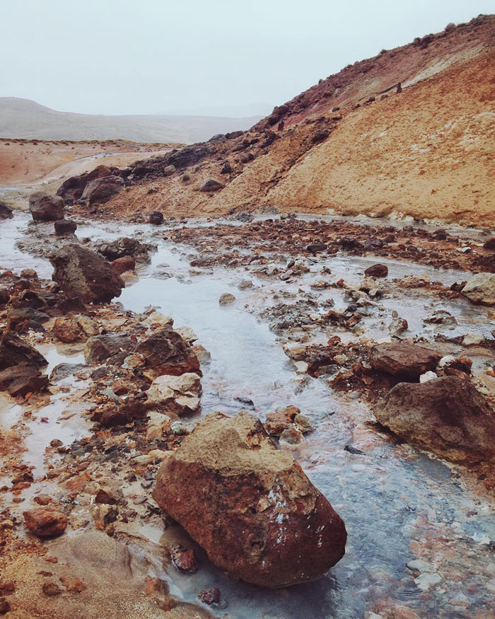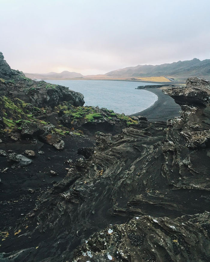 The strip is about fourteen miles wide at its narrowest part (not eight as shown on the existing maps), and extends north and south about twenty-five miles. Strytur is on the divide, or water-parting, between one system of rivers flowing north and another flowing south, and it stands on the highest part of this strip of land. The lava, as it issued from the volcano, flowed north and south down gentle declivities, and spread out east and west almost to the outlying ranges on the margins of the ice-fields. North it extends to just beyond Dufufell, and south almost to Lake Hvitarvatn.